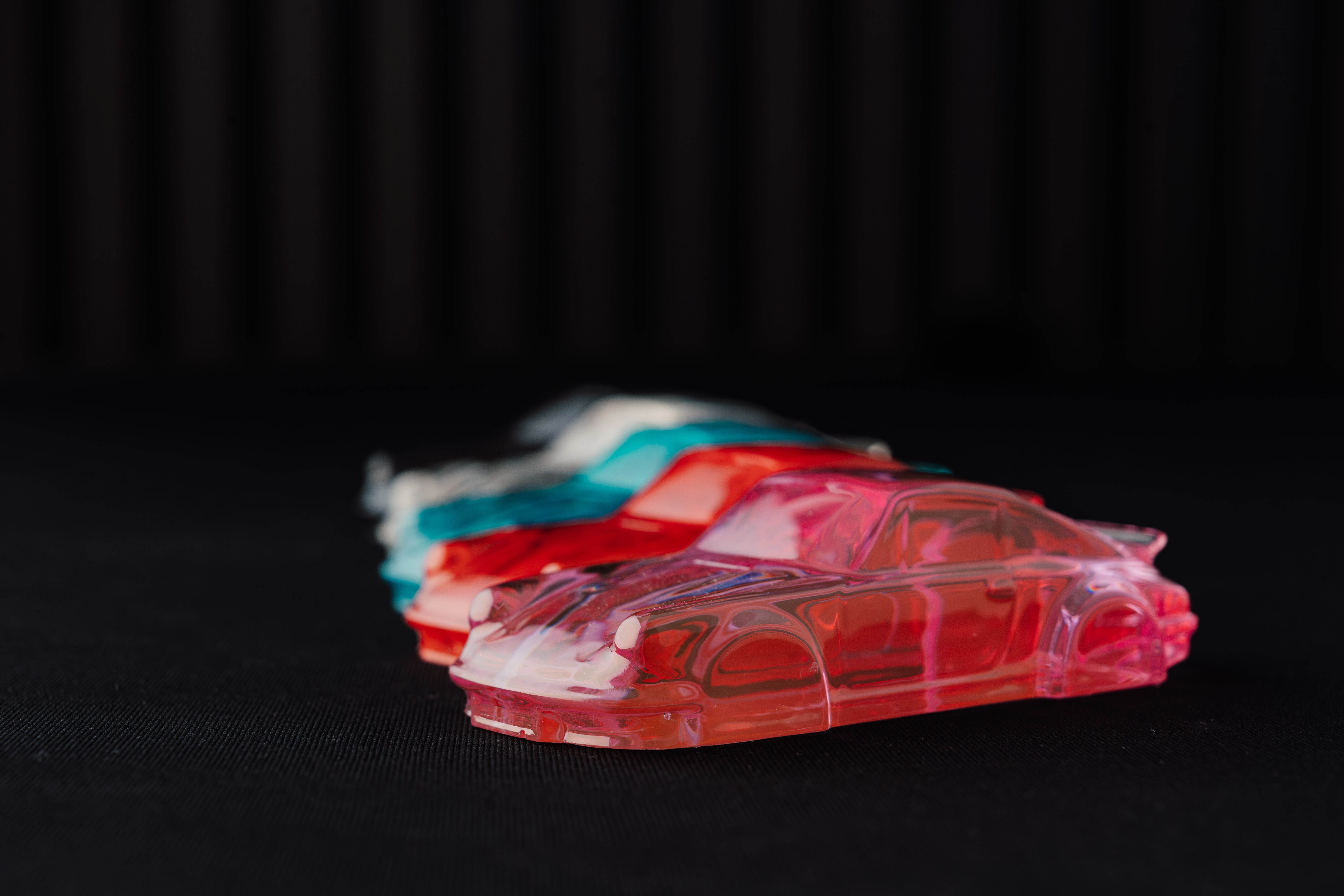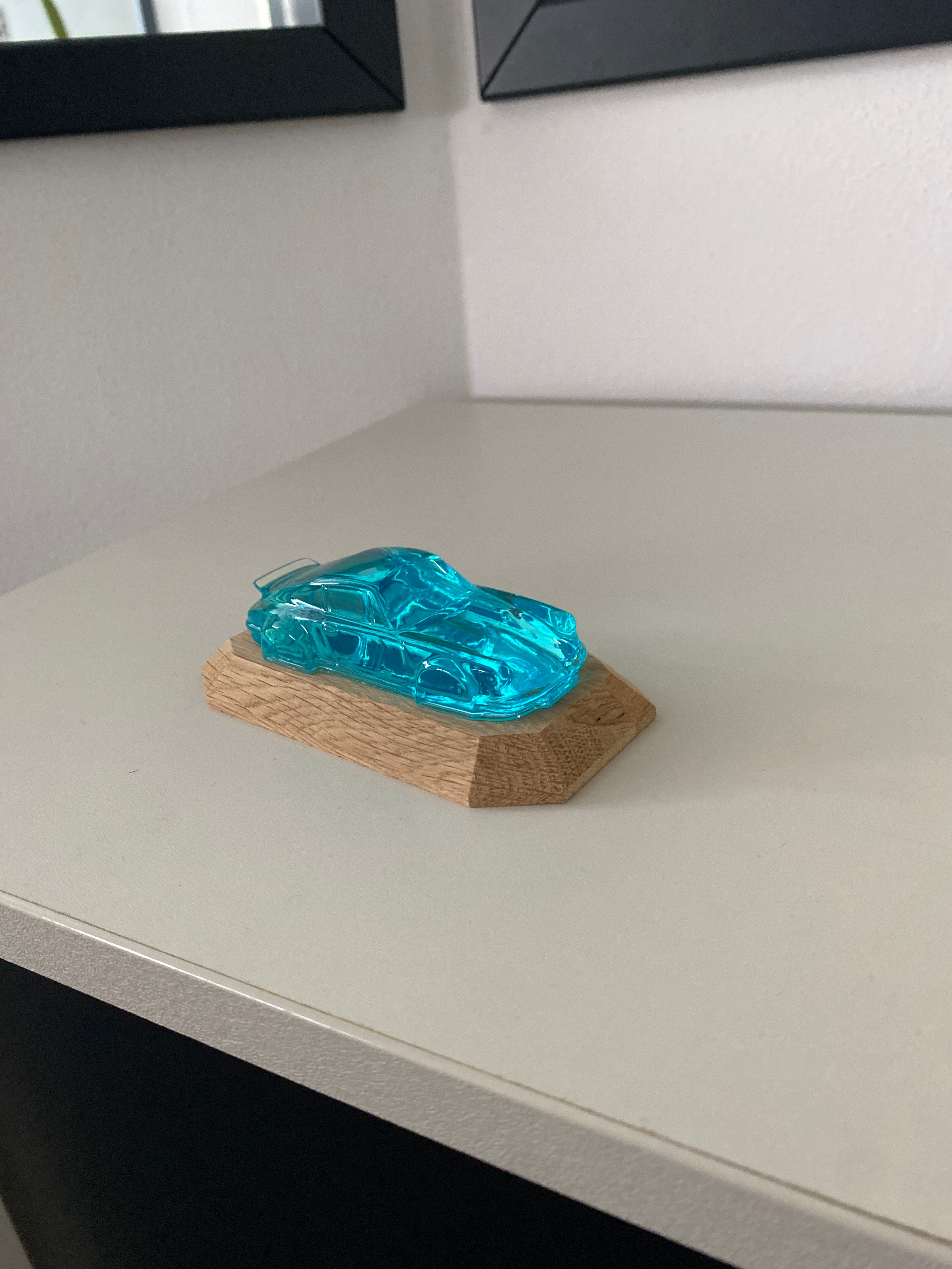 Aus hochglänzendem Epoxidharz, gegossen und poliert. Das Podest ist aus Holz, mit Filzgleitern.